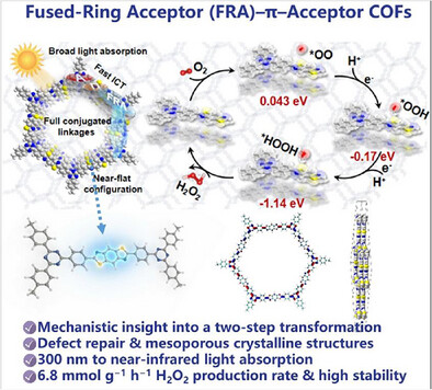日前,实验室王洋团队与合作者在Angewandte Chemie International Editions期刊发表题为《Fused-Ring Acceptor–π–Acceptor Architecture Enables Near-Infrared-Absorbing Mesoporous Covalent Organic Frameworks for Enhanced H2O2 Photosynthesis》的研究文章,实验室博士生赵智伟为论文共同第一作者。